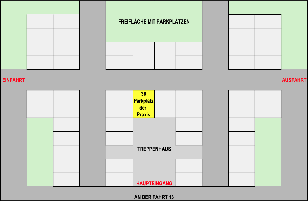 Der Praxis-Parkplatz befindet sich in der offenen Tiefgarage, Platz-Nummer 36. Die Einfahrt ist links vom Haus. Sobald man unten ist, geht es nach rechts zu den Parkplätzen. Der Praxis-Parkplatz befindet sich auf der geraden Strecke, rechterhand, mittig. Er ist durch ein Hinweisschild kenntlich gemacht.